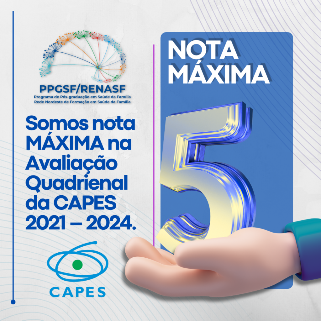 O PPGSF/RENASF alcançou NOTA MÁXIMA (5) na Avaliação Quadrienal da CAPES 2021–2024, resultado que reconhece a excelência acadêmica, científica e o compromisso com a formação qualificada em Saúde da Família no Nordeste.